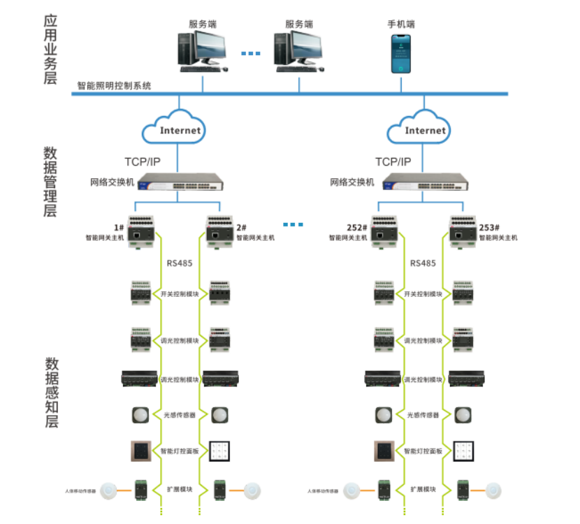 智能照明控制系统,能够对各种照明灯具进行远程监控,具有集中控制、智能远程控制、灯光亮度调节、定时控制、场景切换、电流检测等功能,达到对各个照明控制箱的参数设定、修改以及场景照明状态监控目的,记录灯具全生命周期,有效控制能源消耗、提高灯具寿命、降低维护和管理成本,达到安全、节能、舒适、高效、人性化的效果。